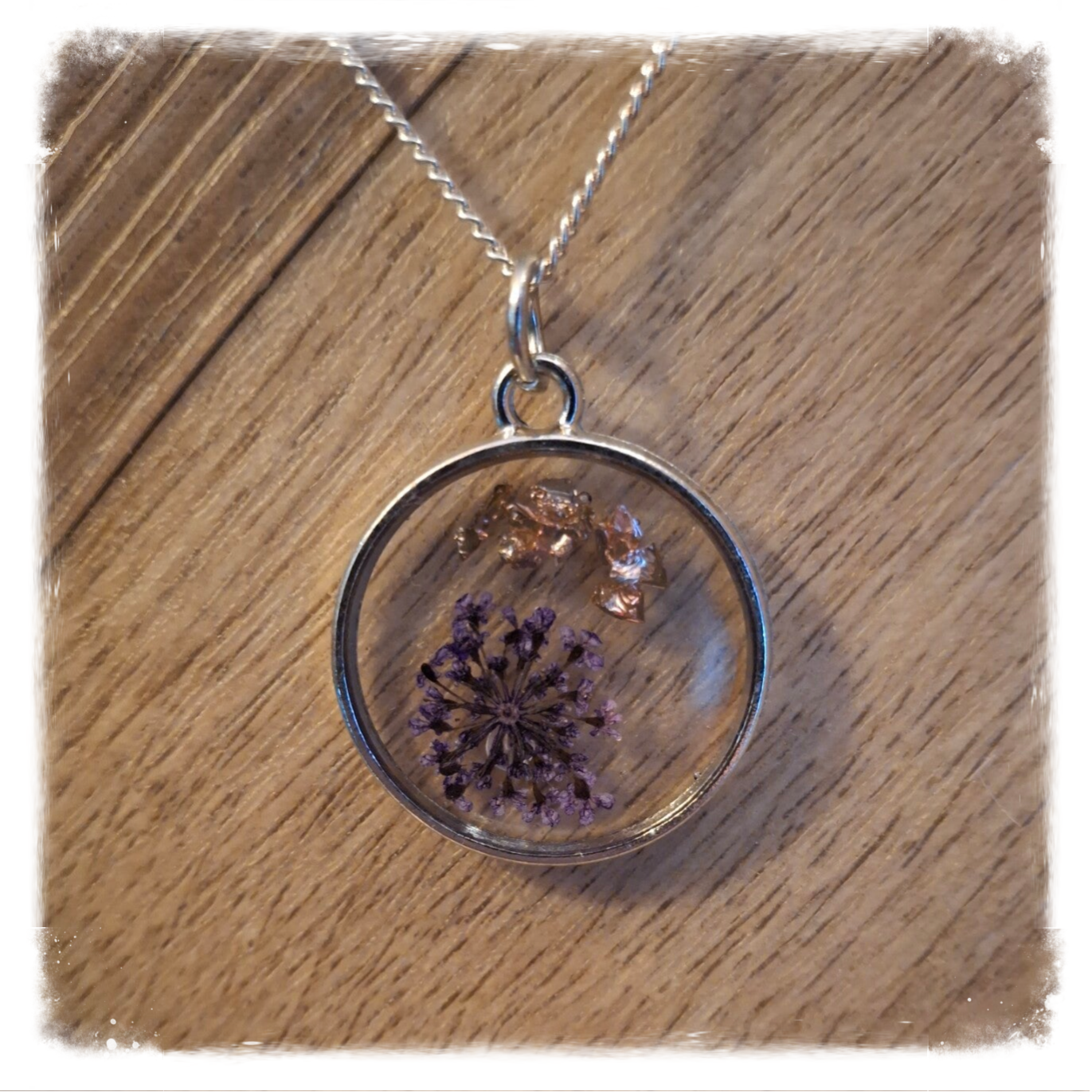 De hanger bevat een gedroogde paarse bloem en fonkelende roze steentjes.