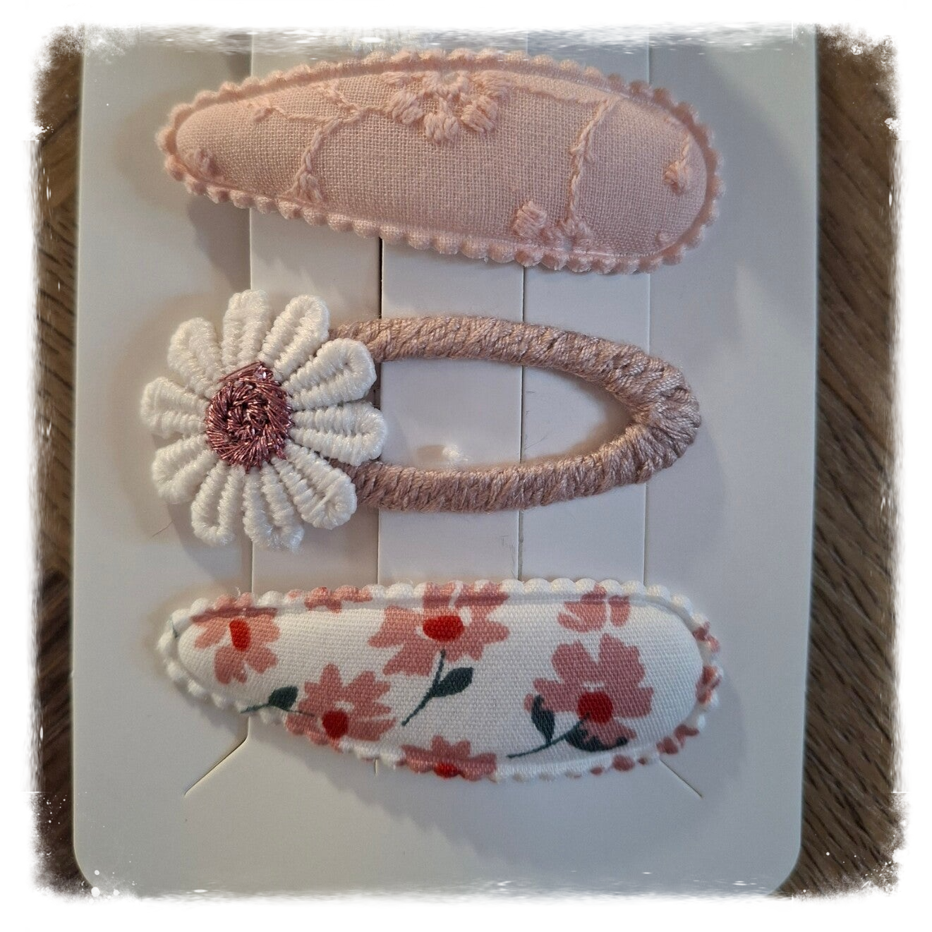 Elk klemmetje is bekleed met een unieke stof in zachte, romantische kleuren en bloemen.