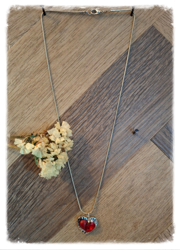 De eyecatcher is de hartvormige hanger met een uniek reliëf en een glanzend en mat rood hartje in het midden. Deze combinatie van zilverkleur en dieprood geeft het sieraad een klassieke, maar toch speelse uitstraling.