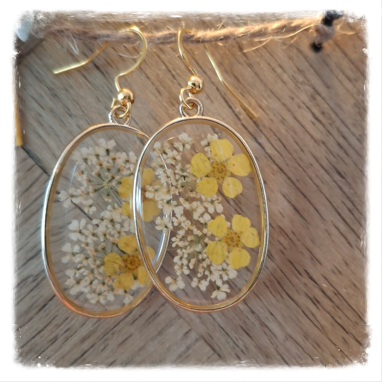 Voeg een vleugje elegantie toe aan je look met deze goudkleurige oorbellen. De delicate gedroogde gele en witte bloemen zorgen voor een speelse maar verfijnde uitstraling.