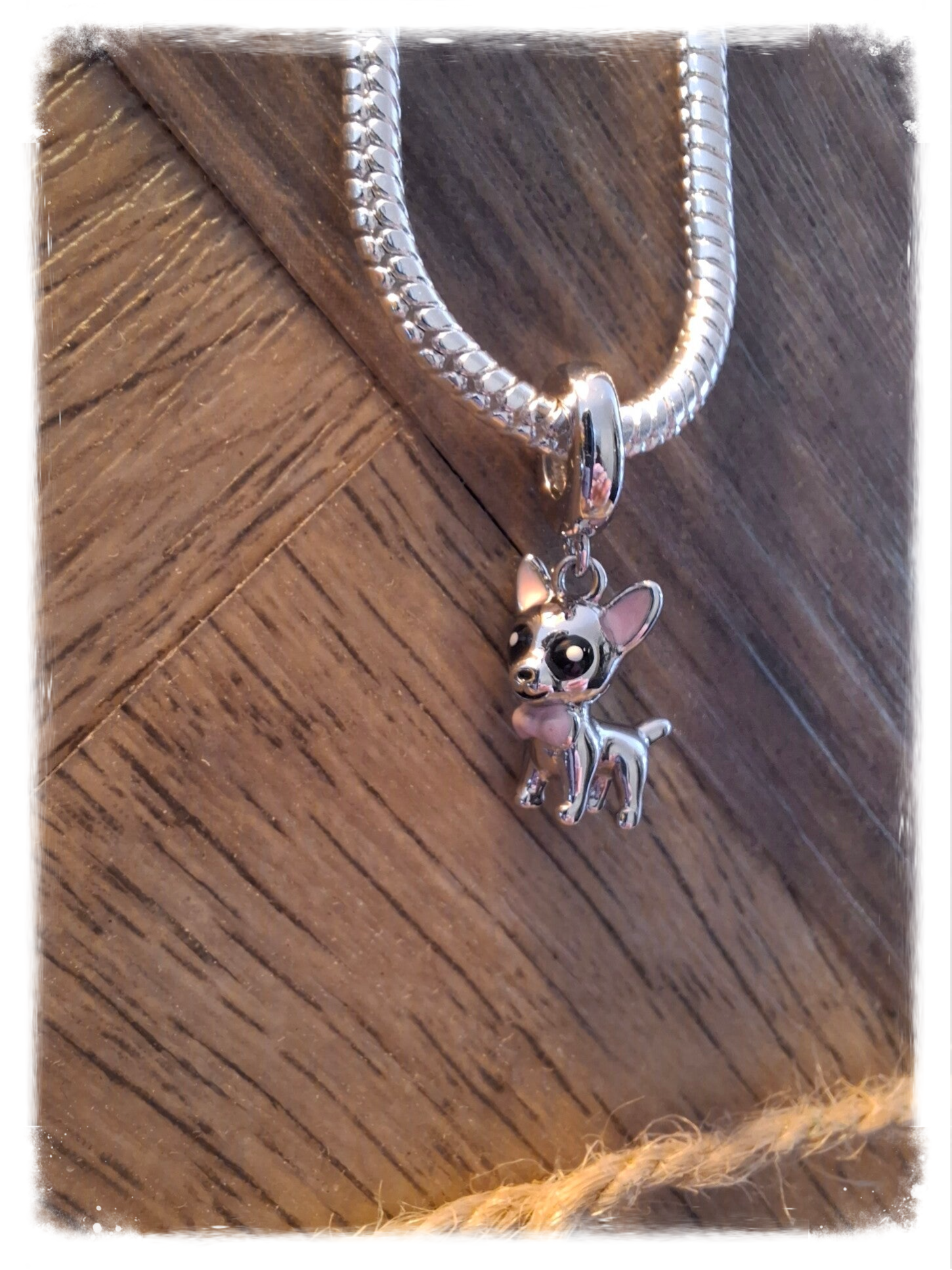 De slangenschakel armband is voorzien van een schattige chihuahua bedel, verfijnd afgewerkt met zwart en zachtroze details.