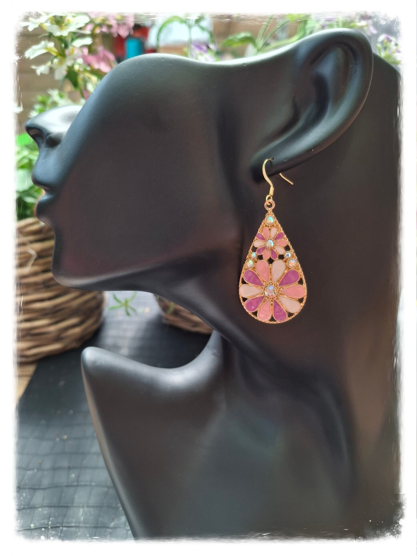 Het bloemmotief in verschillende tinten roze wordt prachtig geaccentueerd door fonkelende lichtblauwe steentjes, wat deze oorbellen een speelse én chique uitstraling geeft.